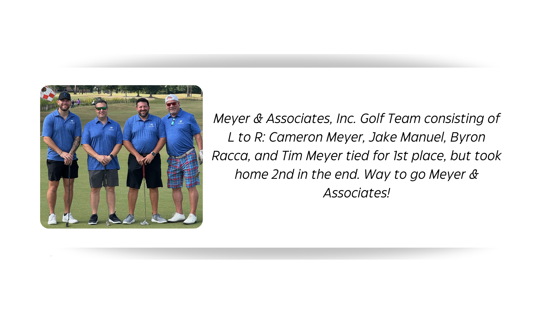 Meyer & Associates, Inc. Golf Team consisting of Cameron Meyer, Jake Manuel, Byron Racca, and Tim Meyer tied for 1st place, but took home 2nd in the end. Way to go Meyer & Associates!